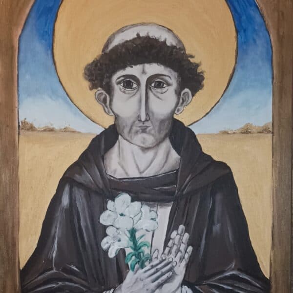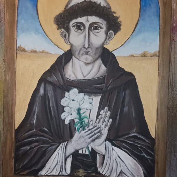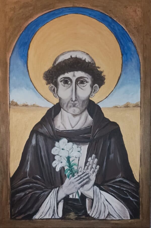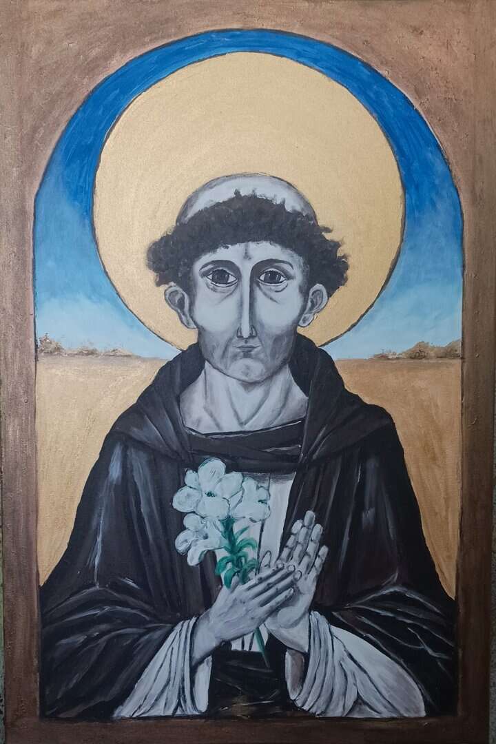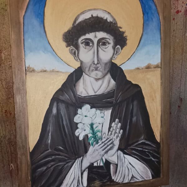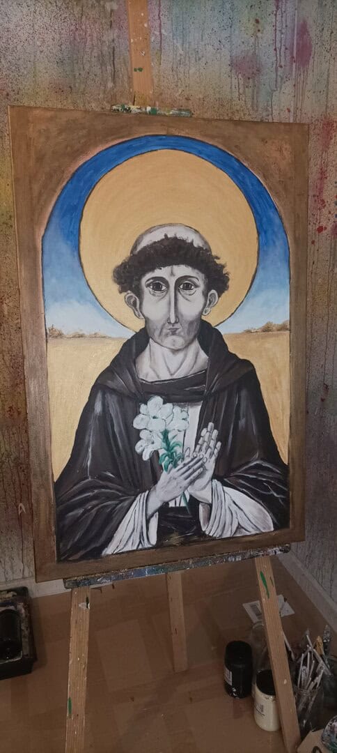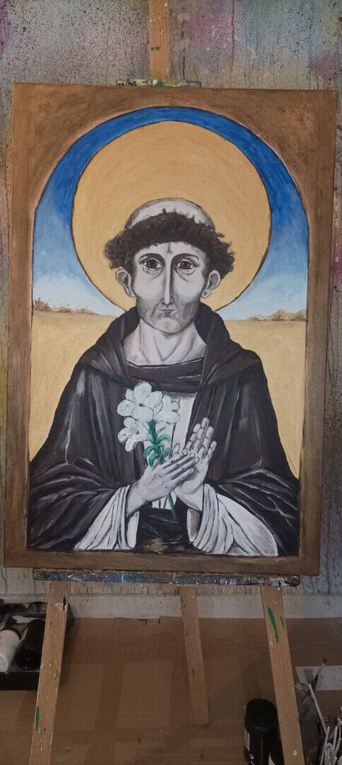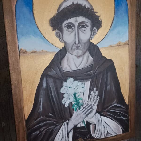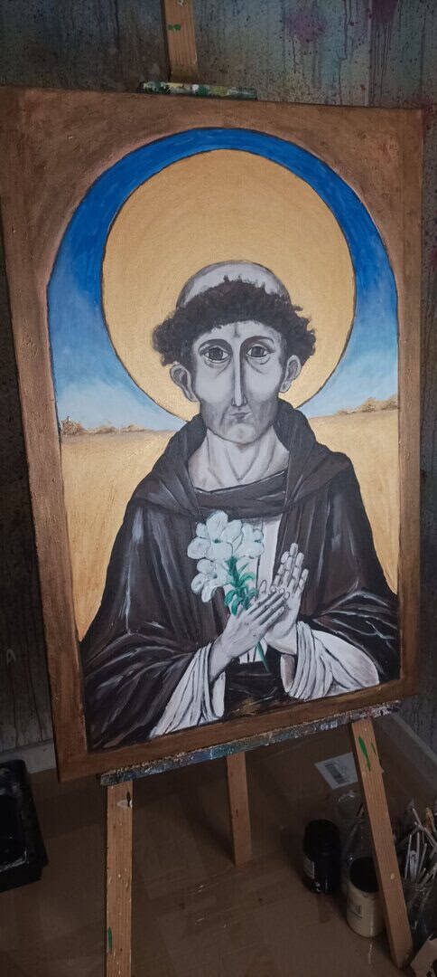Twarz świętego jest pełna spokoju i refleksji – z lekko zaznaczoną asymetrią, która nadaje postaci ludzkiego charakteru. Złota aureola, wykonana z użyciem metalicznych farb, subtelnie odbija światło i daje wrażenie nadprzyrodzonego blasku, które na żywo robi ogromne wrażenie. Obraz „oprawiono” w malowaną ramę, która tworzy wrażenie, że patrzymy na postać przez okno duszy lub sakralny portal.